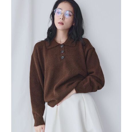 大きめの襟とフロントのスキッパーディティールがポイントの、トレンド感のあるニットトップス。