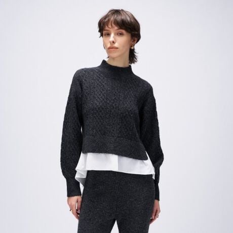 ・ニットと布帛をドッキングした異素材デザインで、1枚でレイヤード風の着こなしが楽しめるペプラムニット。