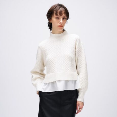 ・ニットと布帛をドッキングした異素材デザインで、1枚でレイヤード風の着こなしが楽しめるペプラムニット。