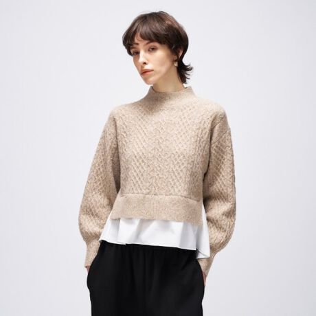 ・ニットと布帛をドッキングした異素材デザインで、1枚でレイヤード風の着こなしが楽しめるペプラムニット。