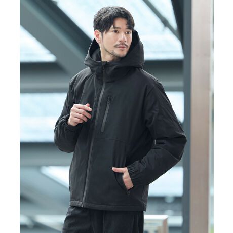 ご自宅の洗濯機で洗えるポリエステル中綿を詰めました。表面は着膨れ感が出ないようにシームレスデザインを採用していますが、裏側でしっかりステッチを入れることで洗濯時の綿の偏りを防止する設計となっております。さらに表地には撥水加工も施し、多少の雨や雪はブロックすることができるように仕上げました。