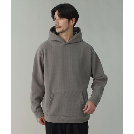 身幅や腕まわりを広めに取った窮屈感のないゆったりシルエット。肩を落としたドロップショルダーも、リラックス感を生むのに一役買っています。フロントにはカンガルーポケットが付いており、スマホなどの小物を収納することが可能。フード部分は立ち上がりをキープしてキレイなシルエットを生み出すため、生地を二重にして厚みを出しました。
