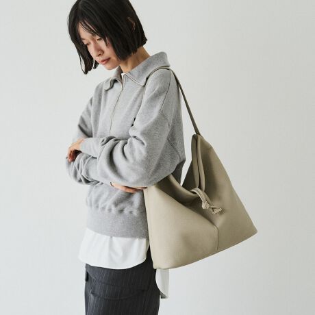 柔らかなレザーが生み出す自然なドレープが美しく、大きめバッグをゆるっと持つことで、こなれたムードを演出します。