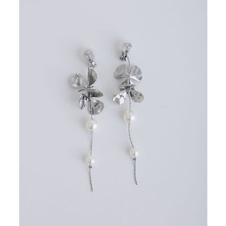 華奢なチェーンに、花びらのようなモチーフとパールが連なるイヤリング。
