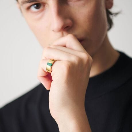 GOLD:18Kプレートの華やかな輝きと、マラカイトの品格ただよう深緑が手元から着こなしにクラス感をもたらします。