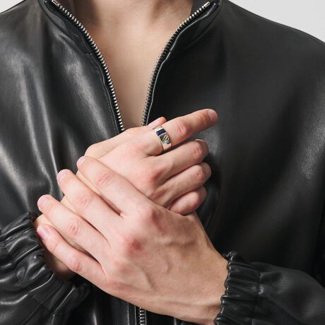 手元で大胆な存在感を放つ、重厚なフォルムのリング。