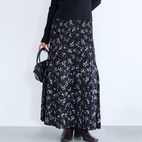 ・繊細なプリーツと上品な花柄が女性らしさを引き立てるロングスカート。