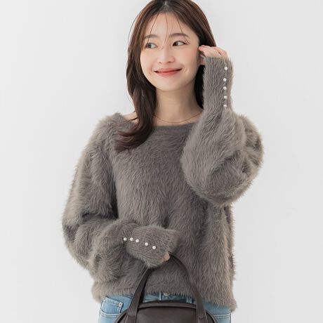 シンプルなボトムスと合わせるだけで、袖パールとシャギーの存在感が際立つ華やかなスタイルに。