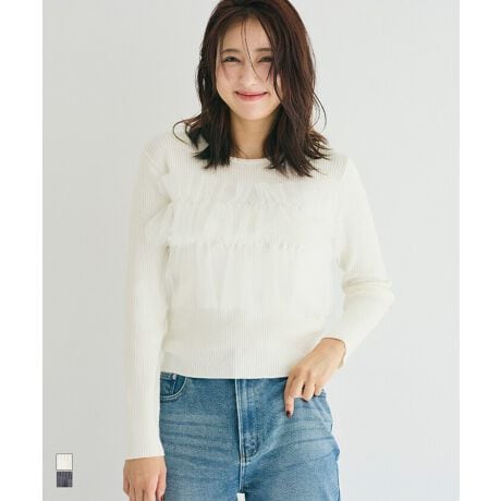 立体的なチュールフリルをドッキングしたリブニットトップス。