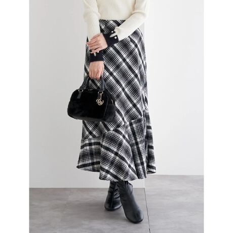 [型番:25550720434]起毛素材のチェック柄が季節感を添えるマーメイドスカート。斜め切り替えとフレアラインが美しく、動くたびにふんわり揺れるシルエットが魅力です。ニットを合わせて大人カジュアルに、ブラウスと合わせて上品にも。ブーツとの相性も良く、秋冬コーデの主役になる1枚です。モデル(黒/茶/グレー着用)身長:160cmMサイズ着用