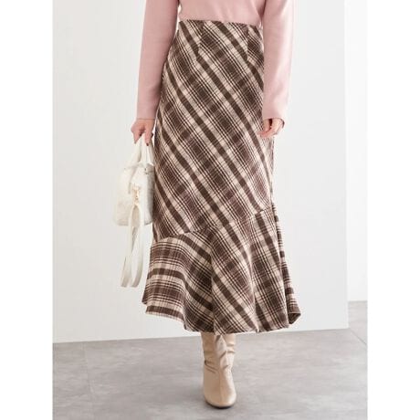 [型番:25550720434]起毛素材のチェック柄が季節感を添えるマーメイドスカート。斜め切り替えとフレアラインが美しく、動くたびにふんわり揺れるシルエットが魅力です。ニットを合わせて大人カジュアルに、ブラウスと合わせて上品にも。ブーツとの相性も良く、秋冬コーデの主役になる1枚です。モデル(黒/茶/グレー着用)身長:160cmMサイズ着用