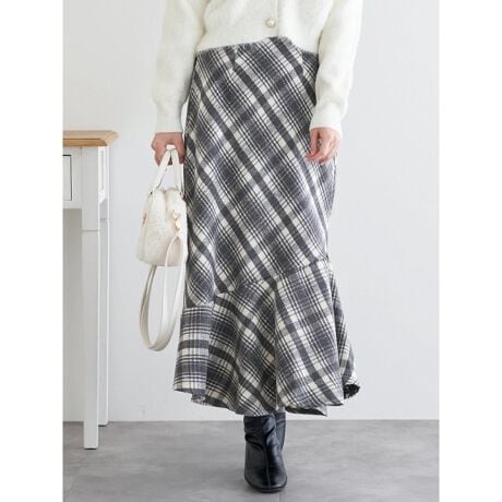 [型番:25550720434]起毛素材のチェック柄が季節感を添えるマーメイドスカート。斜め切り替えとフレアラインが美しく、動くたびにふんわり揺れるシルエットが魅力です。ニットを合わせて大人カジュアルに、ブラウスと合わせて上品にも。ブーツとの相性も良く、秋冬コーデの主役になる1枚です。モデル(黒/茶/グレー着用)身長:160cmMサイズ着用