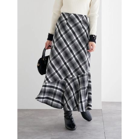 [型番:25550720434]起毛素材のチェック柄が季節感を添えるマーメイドスカート。斜め切り替えとフレアラインが美しく、動くたびにふんわり揺れるシルエットが魅力です。ニットを合わせて大人カジュアルに、ブラウスと合わせて上品にも。ブーツとの相性も良く、秋冬コーデの主役になる1枚です。モデル(黒/茶/グレー着用)身長:160cmMサイズ着用