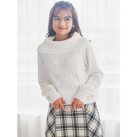 立体感のあるケーブル編みが上品なオフタートルプルオーバー。