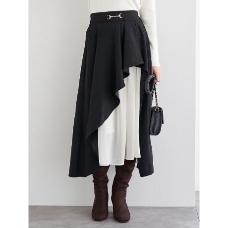 フロントのアシンメトリーなドレープが美しく揺れ、女性らしさを引き立てる異素材コンビのロングスカート。