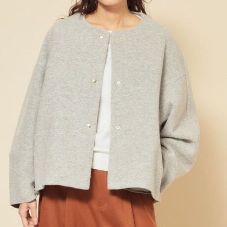 温かみのある素材感と、羽織った時のこなれ感あるシルエットがポイントの1着。