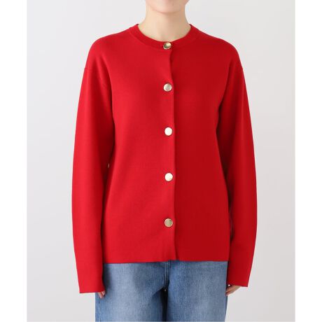 上質な梳毛ウールにストレッチ糸を加えて編み立てた、ふくらみのあるスムース素材のクルーネックカーディガン。