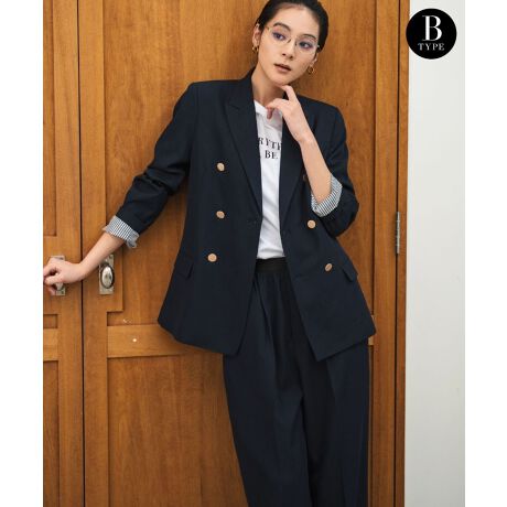 ジャケットはダブルブレストのデザインがどこかマニッシュな印象ながらも、アンティーク風の金ボタンが上品なブレザージャケット。