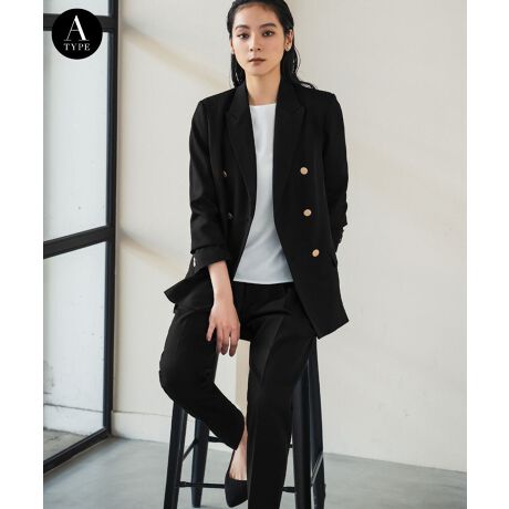 ジャケットはダブルブレストのデザインがどこかマニッシュな印象ながらも、アンティーク風の金ボタンが上品なブレザージャケット。