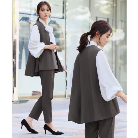 ジレはフレアシルエットでセットのテーパードパンツと合わせると脚長効果が期待できます。