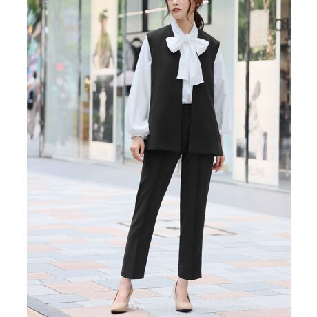 V開きAラインジレにふんわりとしたボウタイブラウス、オンオフ使える美脚ストレートパンツまで付いたお得感のある3点セットアップスーツ。