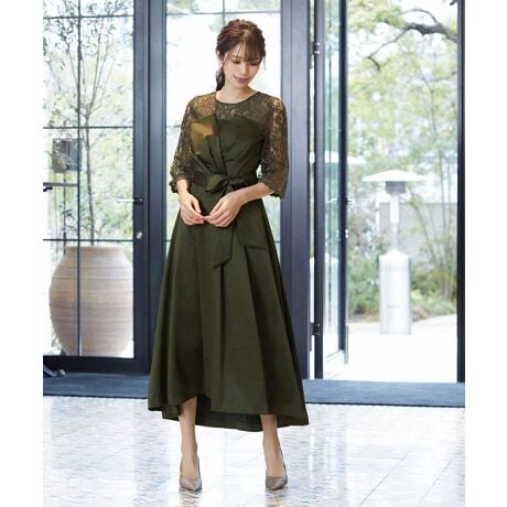 レースの程よい透け感とウエストリボンがレディーな印象のビスチェ風のパーティードレス。