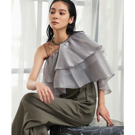 フリルはアシンメトリーの着用はもちろん、リボン前にVに着用や、そのままオフショル使用に、リボンを脇にオフショルや単品としてデニム合わせなどにもマルチに活躍すること間違いなし◎。