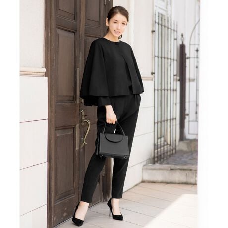 ケープ・ブラウス・テーパードパンツのお得感のある3点セットアップスーツ。