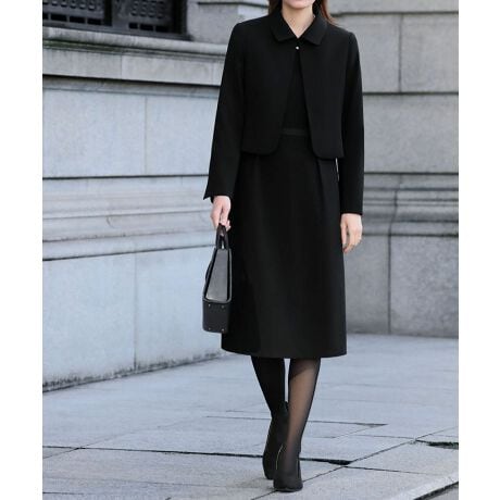 ジャケットと膝下丈のミディアム丈ワンピースがセットになったブラックフォーマルスーツ。