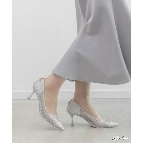 キルティング風パターンのシアー生地が上品な印象のパンプス。