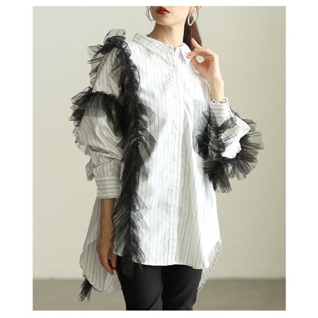 チュールのフリルが印象的にデザインされたシャツです。チュニック丈だから気になるお腹&ヒップ周りも上手にカバー、ビッグシルエットなのでコンパクトなボトムスとの相性抜群です。