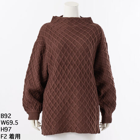 【ポイント】立体感のあるダイヤ編みが表情をプラス。ハイネックで首元まであたたかく、袖口はリブ編みで程よいフィット感。