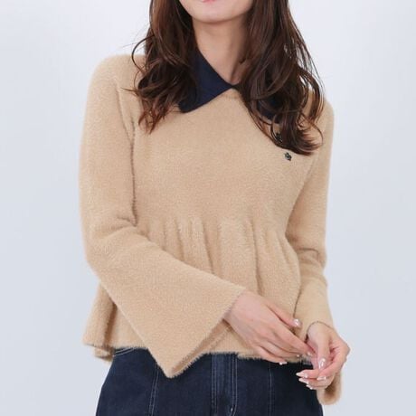 毛足のあるシャギー素材のニット・プルオーバー。◆ポイント・左胸にロゴ刺繍・トレンドの襟付きレイヤードデザイン・ペプラムシルエット&フレア袖・長袖◆コーディネートシルエットの美しさで、スタイルアップも叶う一枚です。[型番:225-704807]