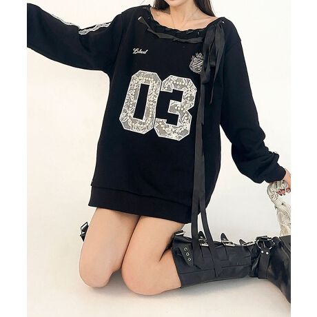 スポーティな「カレッジナンバリングデザイン」に、リボンとレースアップを組み合わせたY2Kガーリースウェット。