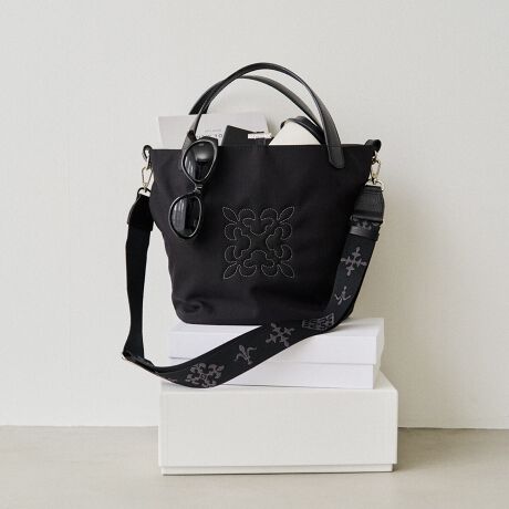 フロントのモノグラム刺繍が、上質なナイロン素材に立体感を添えています。
