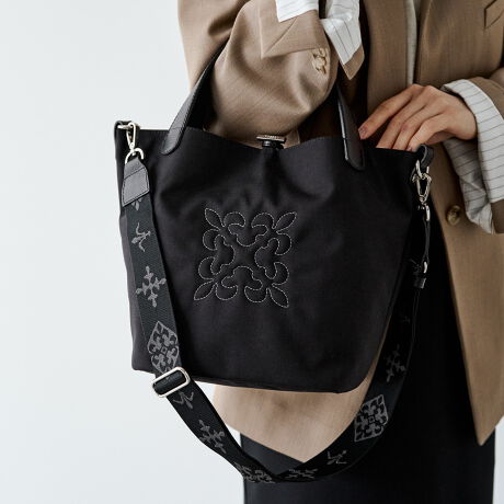フロントのモノグラム刺繍が、上質なナイロン素材に立体感を添えています。