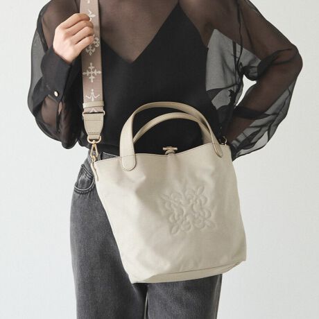 フロントのモノグラム刺繍が、上質なナイロン素材に立体感を添えています。