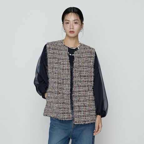 華やかで上質なスペシャルツイードを使用したキーネックカラーツイードジレです。