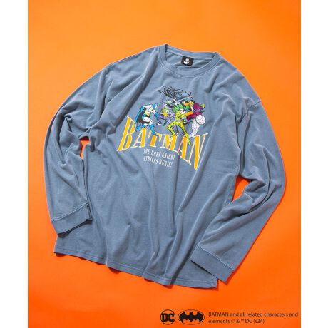 バットマンやヴィランズのクールなプリントロンTに、パウダーブリーチ加工を施すことで、細かい霜降り状の色落ちや加工特有のアタリ感が出て、ヴィンテージライクな、オリジナリティ溢れるデザインになりました。