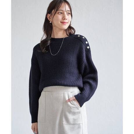 左肩に配したゴールドカラーボタンが目を引く、クラシックな雰囲気の変形リブニットプルオーバー。