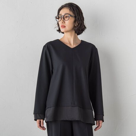 ふんわりとした両面起毛素材に、裾のサテン切り替えがさりげない華やかさを添える一枚。