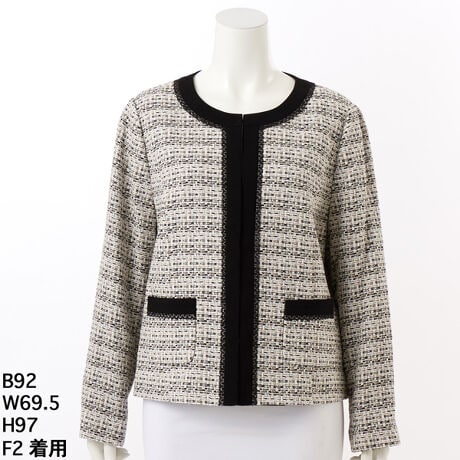 **「上品なツイードの魅力を引き立てる、ツイードノーカラージャケット」**