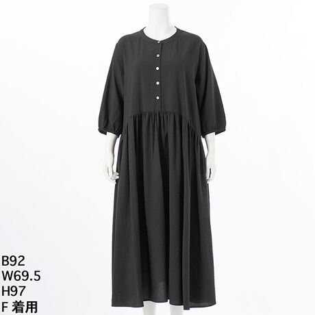 レーヨン綿の凹凸感がある素材でさらっとした着心地で、洗いざらしのままでも、ハンガーで乾かすだけでアイロンいらずに着られるワンピースです。