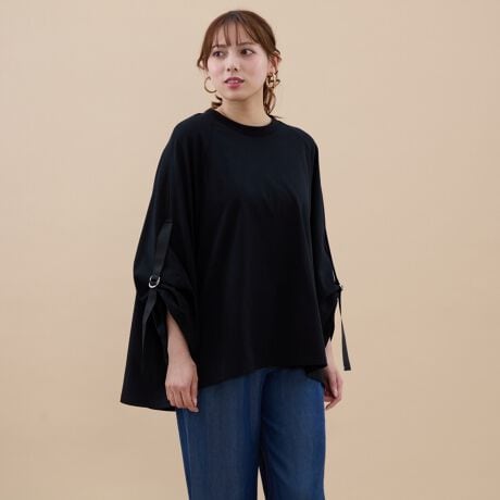 肩のラインを拾わないラグランスリーブ×ゆったりサイズで、リラックス感のある着心地と体型カバーを両立。