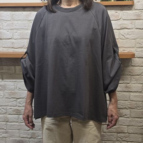 肩のラインを拾わないラグランスリーブ×ゆったりサイズで、リラックス感のある着心地と体型カバーをcm立。