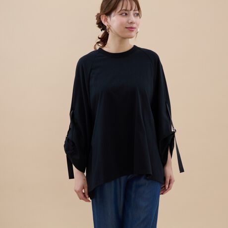 肩のラインを拾わないラグランスリーブ×ゆったりサイズで、リラックス感のある着心地と体型カバーを両立。