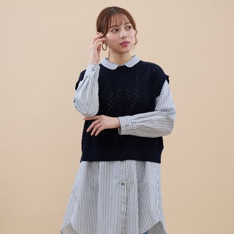 一見シンプルな透かし編みベストですが、背面に配置された2つのボタンが最大のポイント。後ろ姿に程よいトレンド感と抜け感を演出し、シャツ一枚では心もとない日の「体型カバー」と「お洒落」を同時に叶えます。