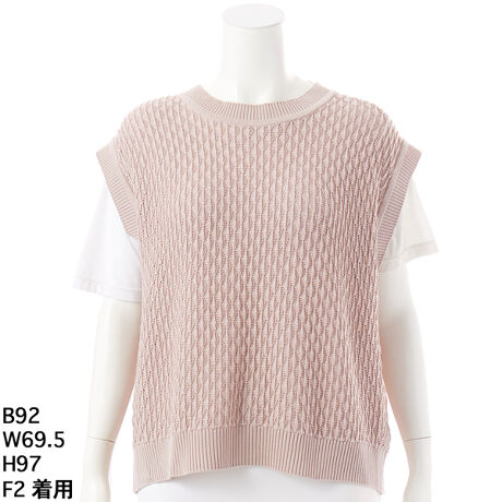 一見シンプルな透かし編みベストですが、背面に配置された2つのボタンが最大のポイント。後ろ姿に程よいトレンド感と抜け感を演出し、シャツ一枚では心もとない日の「体型カバー」と「お洒落」を同時に叶えます。