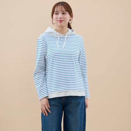 身頃と袖には存在感のある太ボーダーを、フードと袖口には繊細な細ボーダーを配置。視覚的なアクセントをつけることで