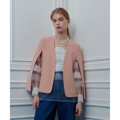 トリアセテート混のダブルクロス素材を使用し、モード感ときちんと感を兼ね備えたケープジャケット。